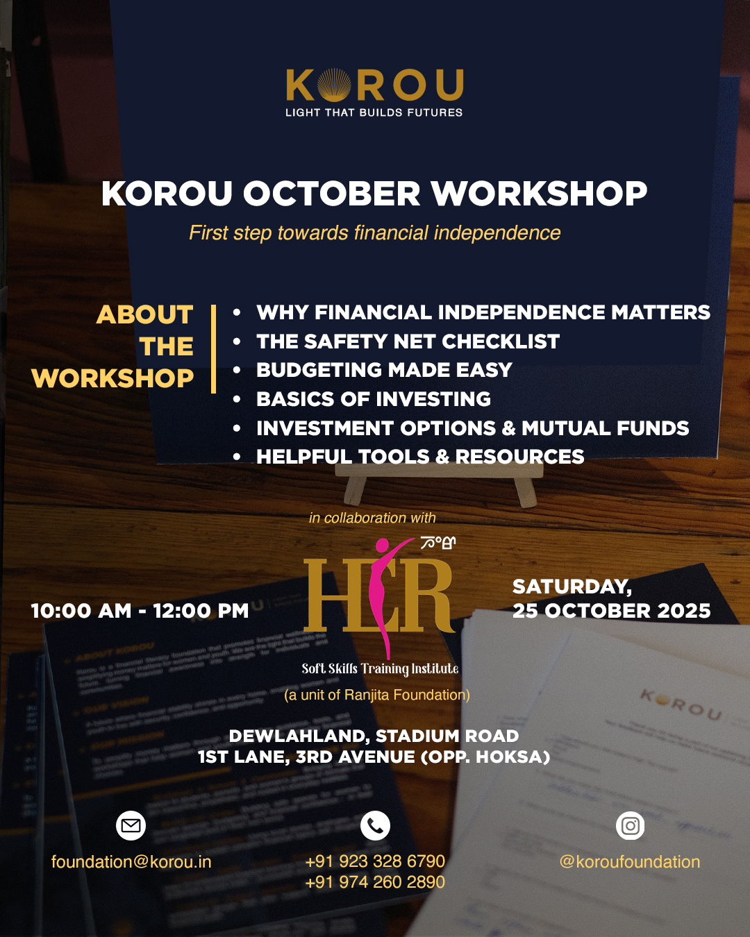 On 25 October 2025, Korou Foundation hosted its second financial literacy workshop in collaboration with HER Soft Skills Training Institute at Dewlahland, Imphal. The session brought together current and ex-candidates of HER for a focused and meaningful conversation around financial independence and wellbeing.